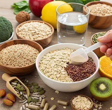 Aveia: Fonte de fibras solúveis, que auxiliam no controle do colesterol.